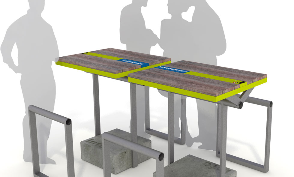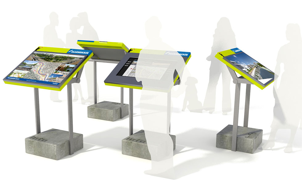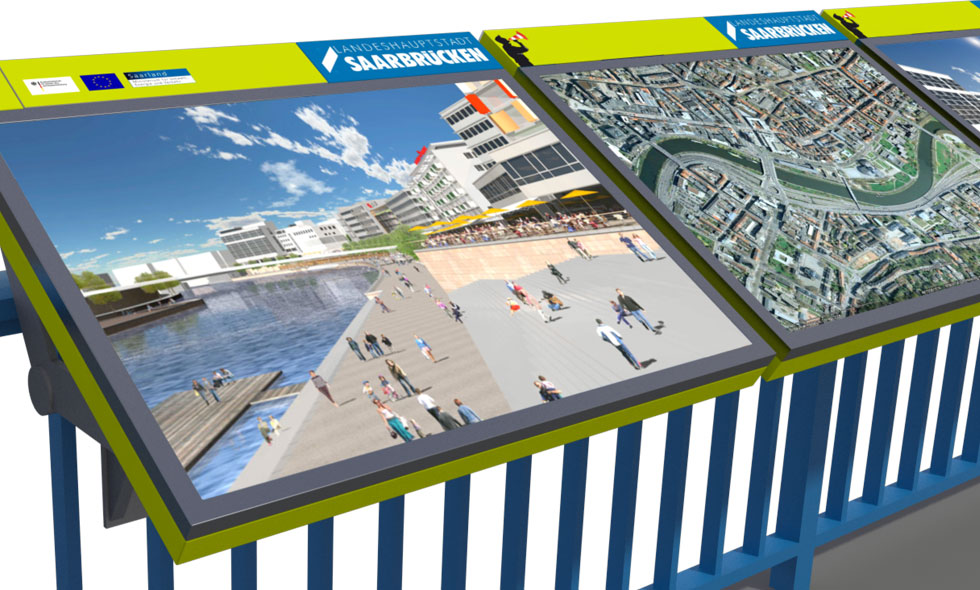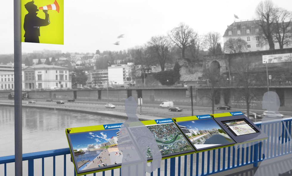 Einladungswettbewerb zur Entwicklung einer baubegleitenden Maßnahme. Thema war die Information des Bürgers über Stand und Fortschritt der Baumassnahme Statdmitte am Fluß in Saarbrücken. An verschiedenen Standorten im Saarbrücker Zentrum sollten an den Brückengeländern "Infoterminals" angebracht sein, die "online" den Stand und Zustand des Bauvorhabens präsentieren.